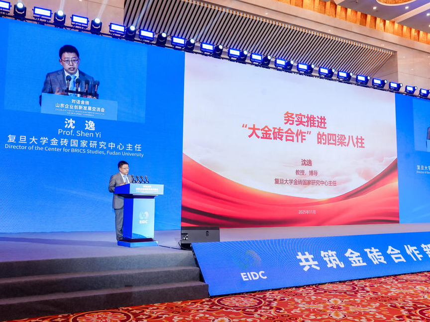 在主题演讲环节,复旦大学金砖国家研究中心主任沈逸教授做了《务实推进“大金砖合作”的四梁八柱》的演讲,他首先回顾了“大金砖合作”的“三年演进”,并表示金融联通、绿色转型、数字智能、人文赋能的“四梁”,以及本币与支付、NDB融资、绿色链、AI与数据、教育与科研平台、合规治理、标准互认、汇率与流动性管理的“八柱”,构成了企业参与“大金砖合作”的可操作框架。