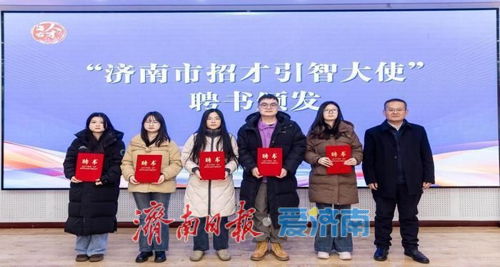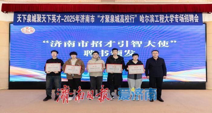 宣讲会现场播放了城市人才宣传片《Lian上这座城刚好遇见你》及主题曲MV、《青年人才政策宣传片》,全方位展现济南的城市魅力与发展活力。通用技术集团工程设计有限公司和山东优宝特智能机器人有限公司作为重点引才单位代表,现场发布岗位需求,向优秀学子发出岗位邀约;中国联通济南软件研究院数据库工程师王健和山东产业技术研究院新一代信息事业部副主任周广通作为校友代表结合自身在济南的发展经历,分享了“选择济南、扎根济南”的成长故事。此外,为进一步扩大活动成效,搭建常态化引才桥梁,引才团为10名山东籍、济南籍优秀学子颁发了“济南市招才引智大使”聘书。